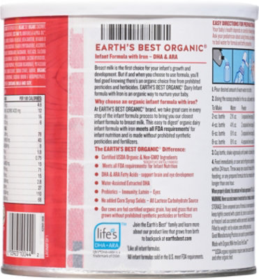› Earths-Best-Organic-FormulaAmazon.com: Earth's Best Organic Baby Formula for Babies 0-12 ... Earth's Best Organic Infant Formula with Iron is our closest formula to breast milk. The formula is fortified with iron for red blood cell development and contains DHA and ARA, two fatty acids found in breast milk that help support brain and eye health. With lutein for eyes and prebiotic fiber for immunity, this is a fantastic formula solution ...